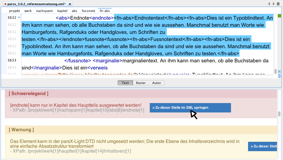 Angezeigt wird, neben Meldungstext und XPath, ein Link-Button, der zu der problematischen Stelle im XML führt.